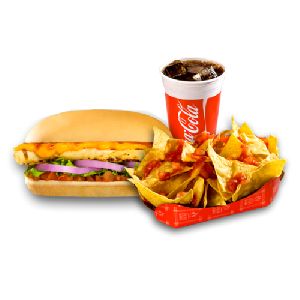 Pão prensado, salsicha perdigão, frango desfiado, batata palha, tomate e catupiry