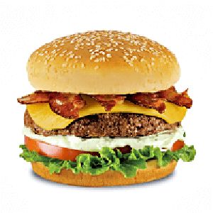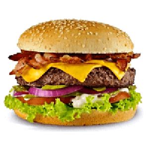 Pão de hambúrguer, hambúrguer 120 gramas, bacon, presunto, alface e tomate