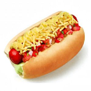 Pão, salsinha perdigão, batata palha, picles e tomate